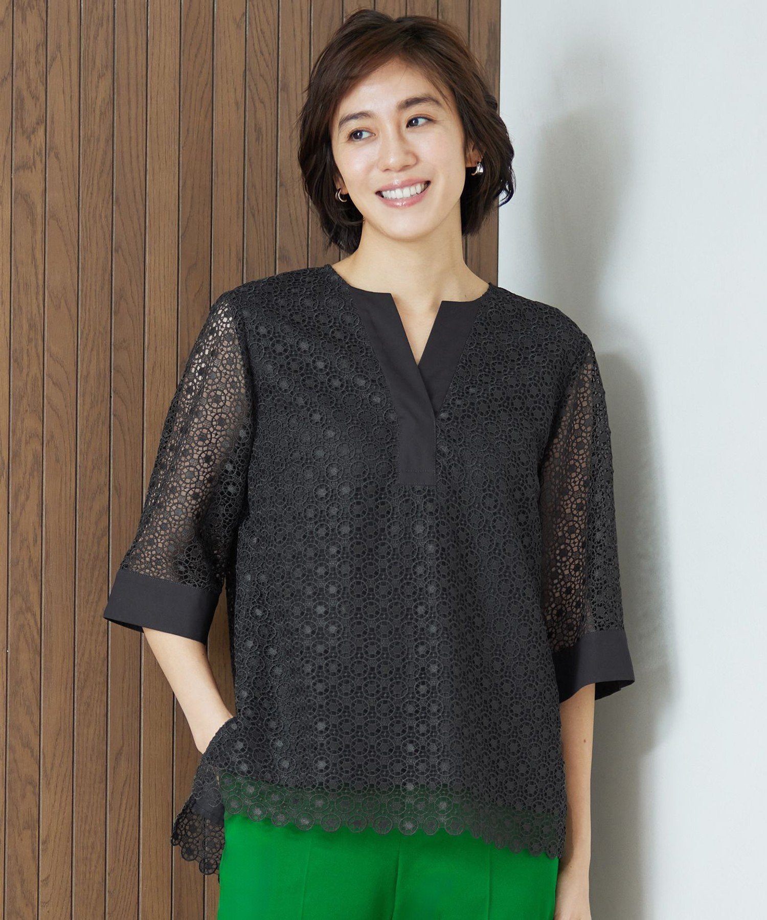 腰まわりがすっきり見える丈感と、フェイスラインを引き締めて見せるネックライン設計で、全体のバランスも◎です。