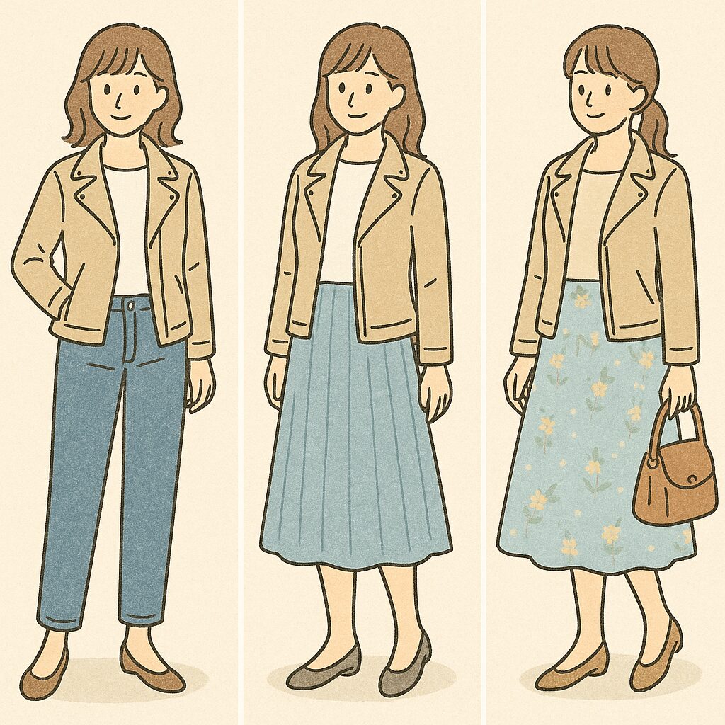 - 軽めのボトムスを選ぶ: デニムやスカートでカジュアルさをプラス。